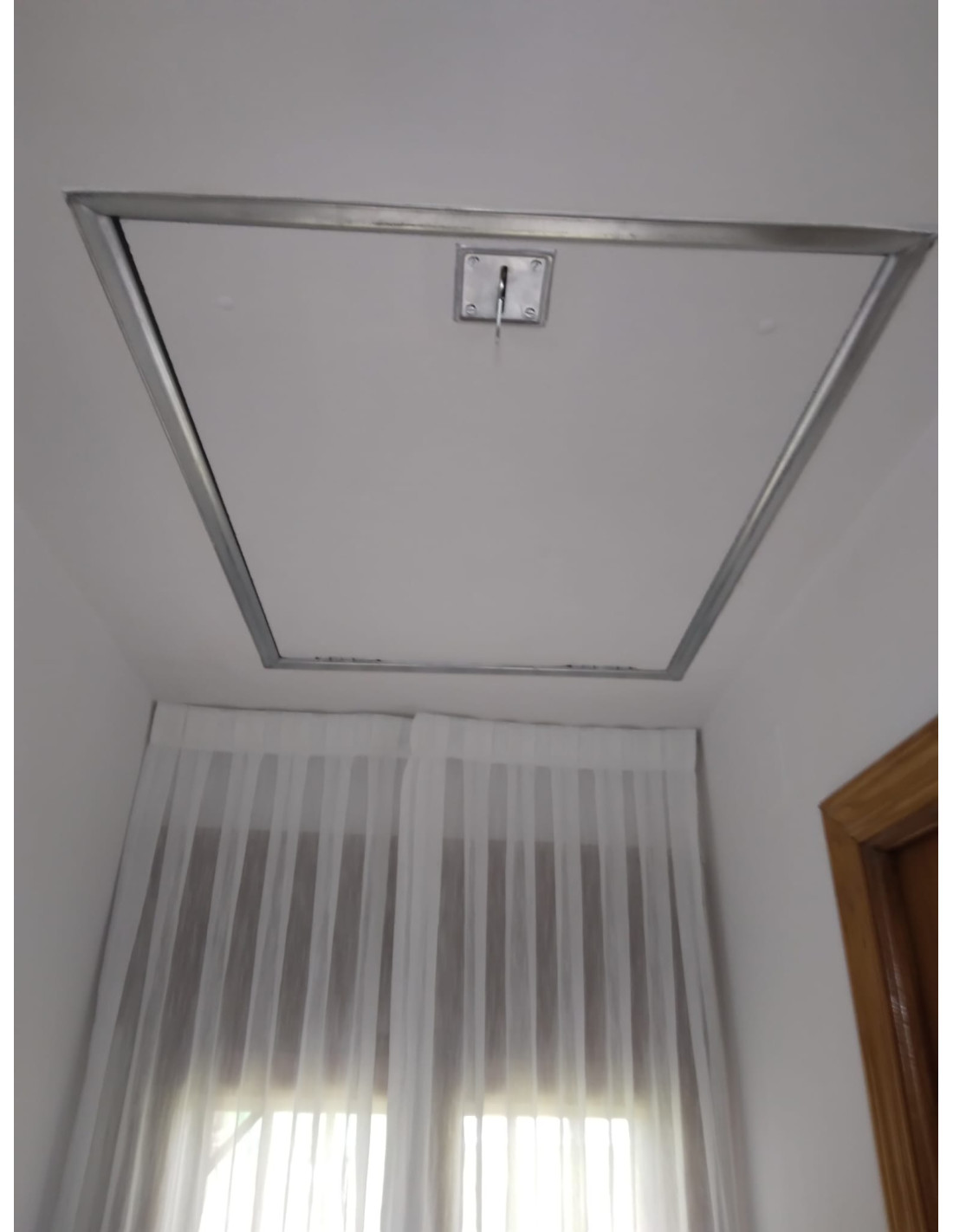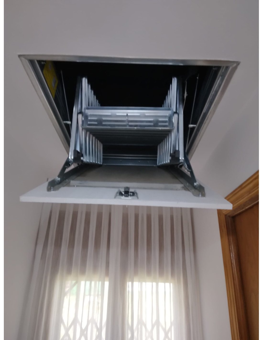 Escalera escamoteable de techo de acero lacado blanco.