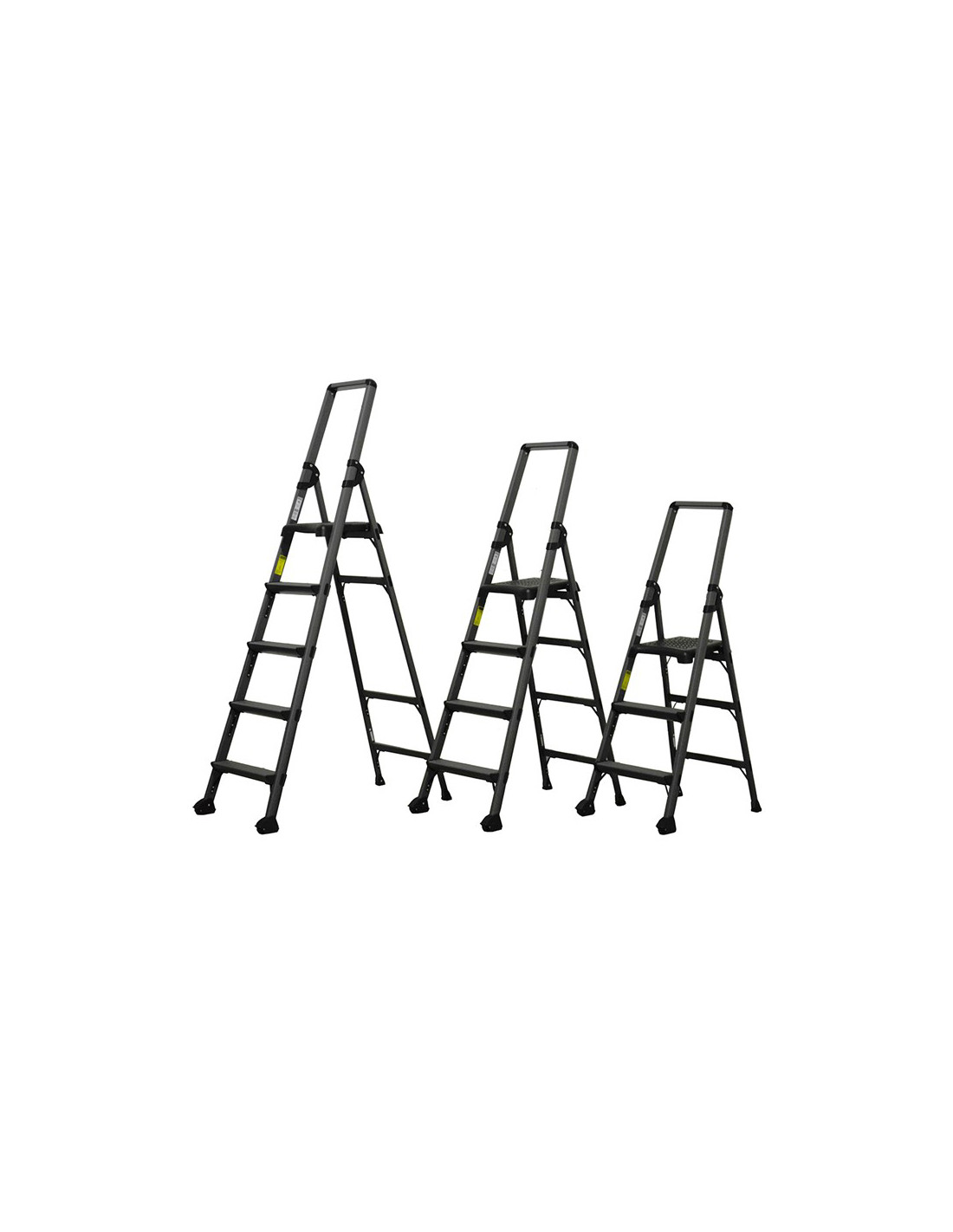 Escalera de aluminio anodizado con plataforma y peldaño ancho, con acabado negro mate. Cuenta con una plataforma de trabajo y un guardacuerpo que aseguran y facilitan el trabajo profesional, incluso cuando el operario tiene que permanecer en altura largos periodos de tiempo de trabajo.